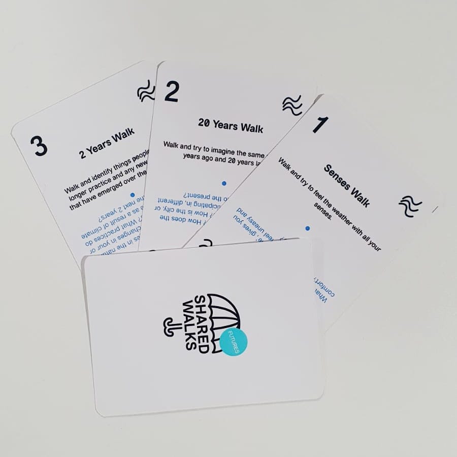 The Shared Walks / Climate Change Edition prototype was tried out by participants of the Climate Existence Conference. Researchers, artists and experts dealing with different aspects of the climate crisis had the chance to experience the newly developed card set and gave feedback on the walks, themes and methodology. We discussed the traces found on the walking routes related to all the themes -weather, emotions, resilience, public spaces, politics, economy- each including three different and interrelated walking prompts.